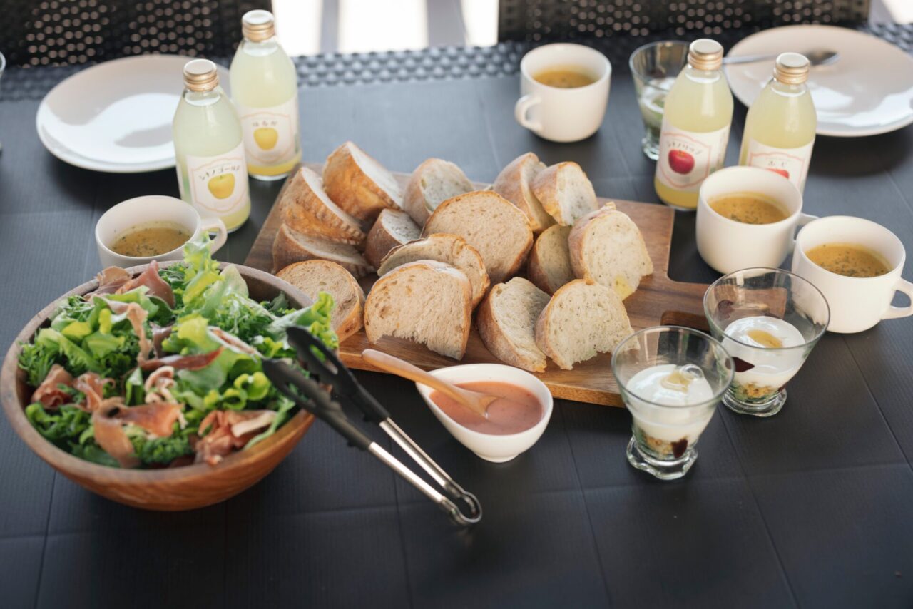 翌朝は、地元のパン屋さんが焼き上げるカンパーニュに季節のポタージュ、フレッシュな生ハムサラダとともに。澄んだ朝の空気の中で、りんごジュース(仕入れにより梨ジュースの場合あり)を喉に流し込む。焚き火の余韻が残る森の中で、体温をゆっくりと上げていく目覚める時間は、滞在の満足度をいっそう深いものにしてくれます。