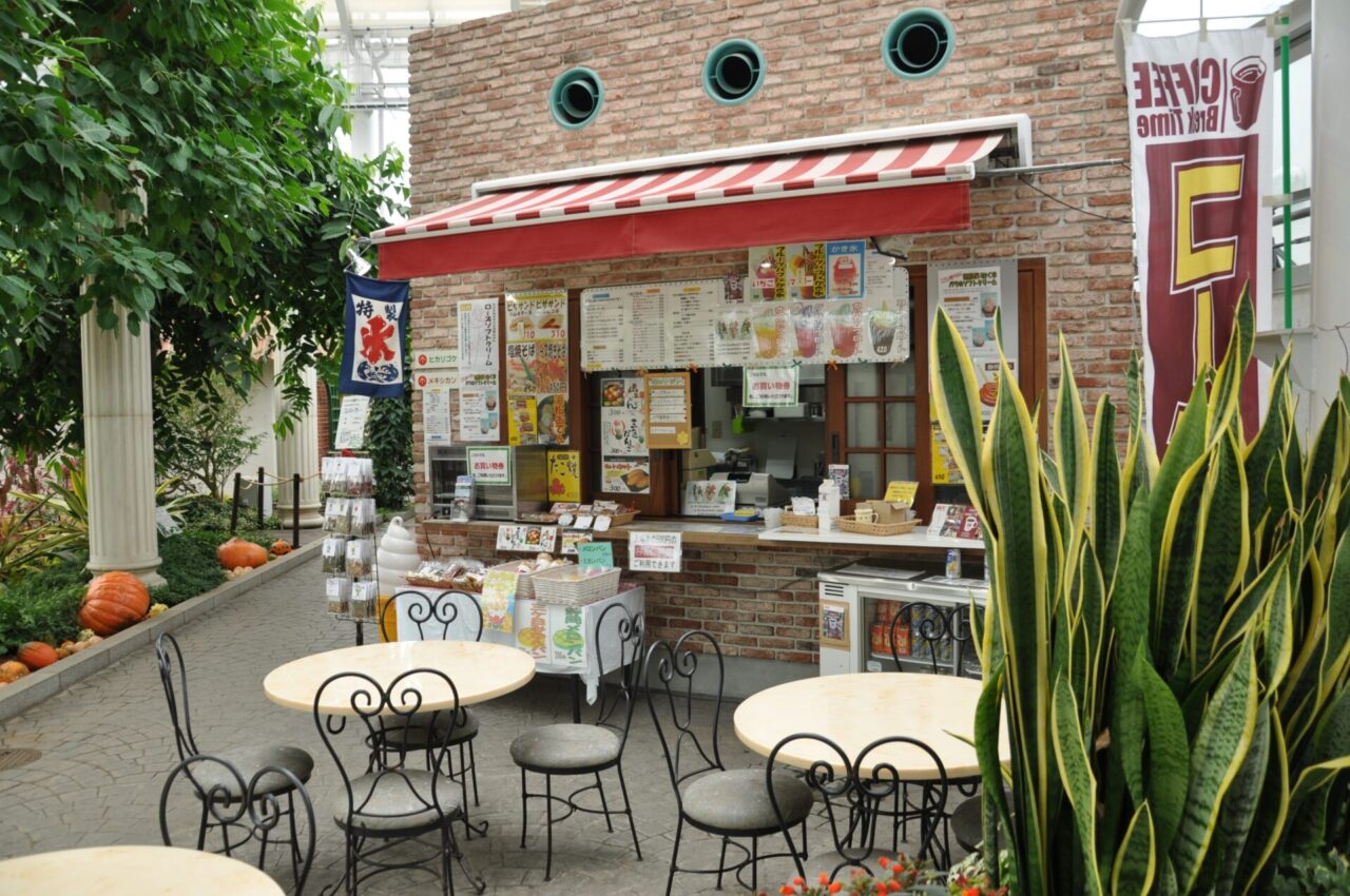正面(メインエントランス)周辺に位置するカフェレストラン「花の散歩道」は、座席数も多く、歩き疲れたタイミングで落ち着いて食事を楽しめる場所。一方、気軽にランチを済ませたいなら、多彩なメニューが揃うカフェハミング「RusomaCafe フラワーパーク店」がおすすめです