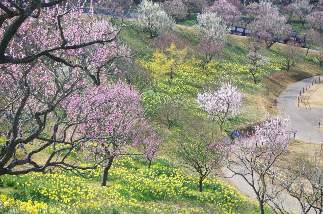 はままつフラワーパークの春は、花の主役が次々と入れ替わる“花リレー”の季節。ロウバイ、ウメ、ナノハナ、早咲きの桜から始まり、ソメイヨシノ、チューリップ、八重桜へとつながり、さらにフジ、春バラへと見どころが続きます。