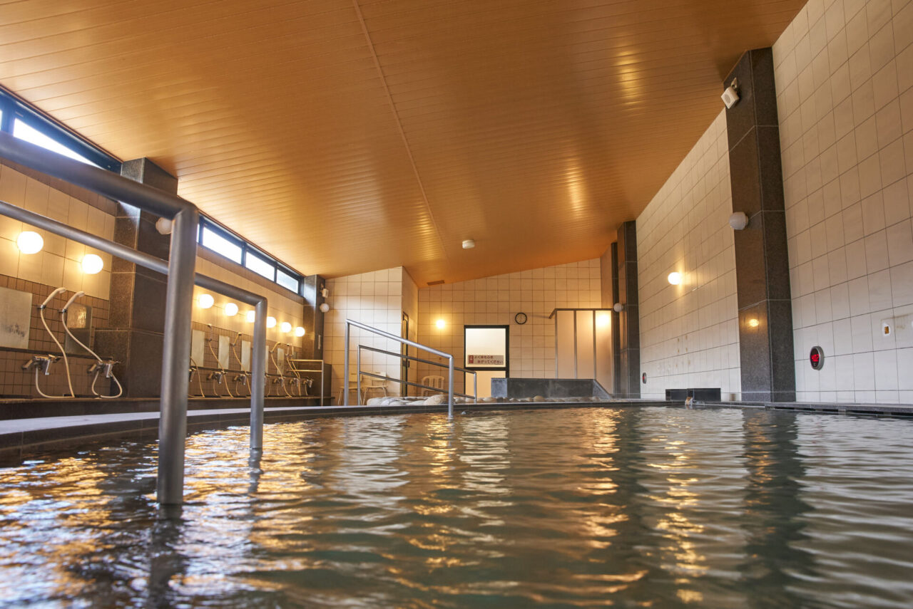 「おふろcafé あげき温泉」は、肌ざわりがやわらかく、赤ちゃんから年配の方まで安心して入浴できるアルカリ性の天然温泉。