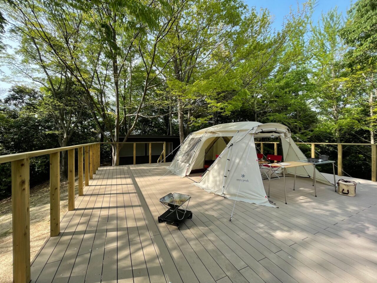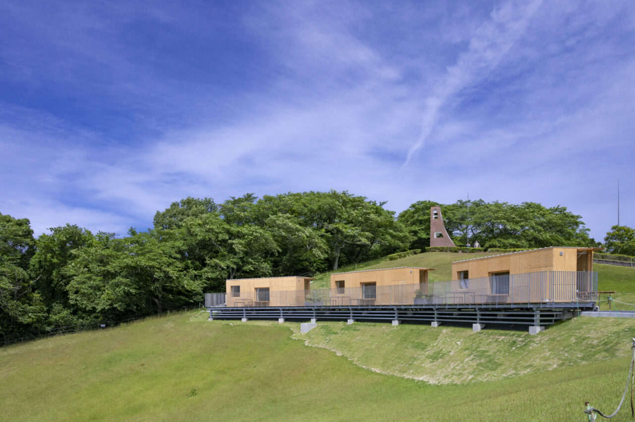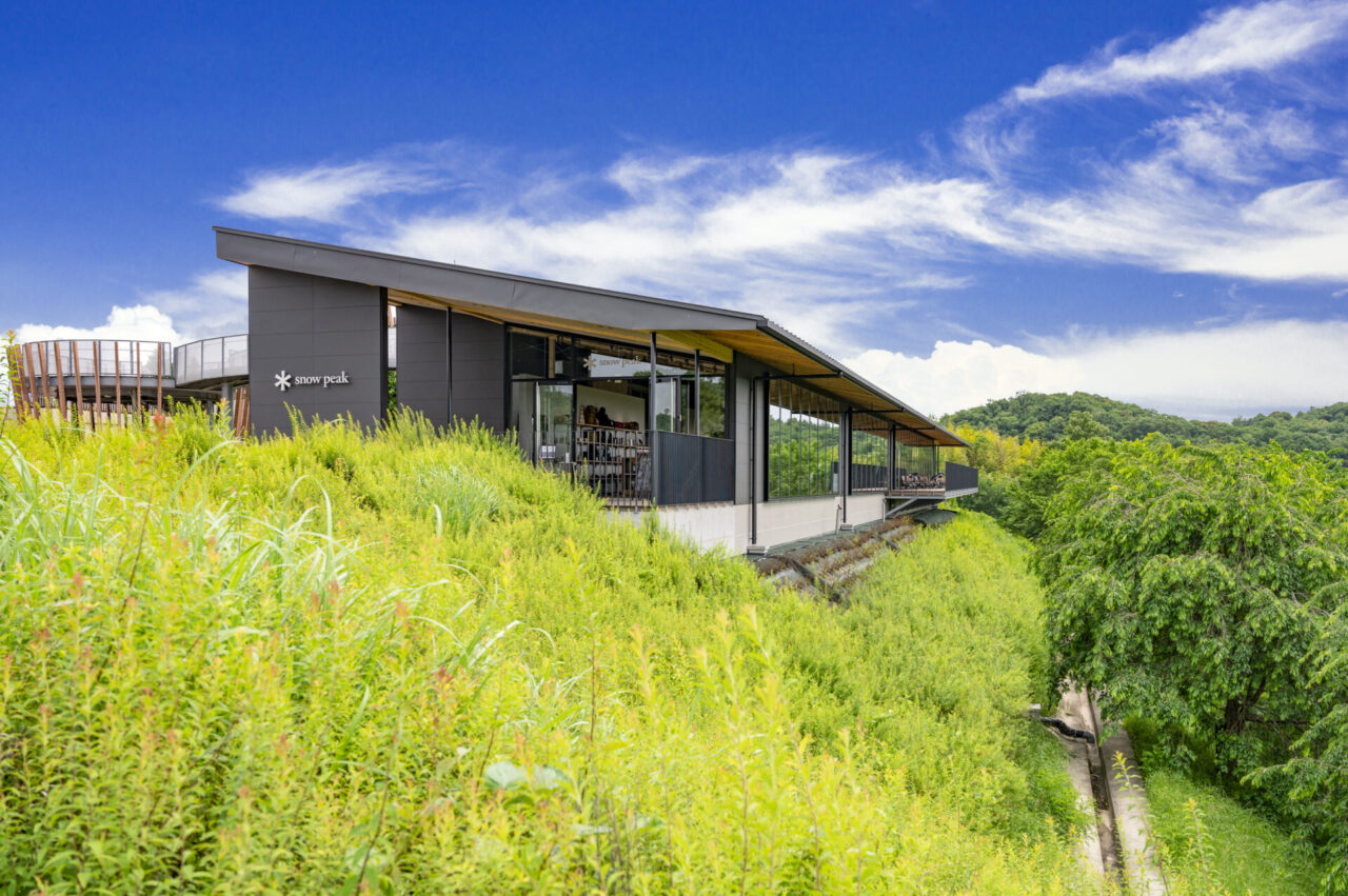 併設の“Snow Peak Cafe”では、地元食材を使ったランチやカフェメニューを緑と空を望むテラス席で楽しめます。宿泊体験は多彩な選択肢をご用意しており、手ぶらで参加できる「ウッドデッキキャンプ」や、隈研吾氏デザインのモバイルハウス“住箱‑JYUBAKO‑”でのグランピングをお選びいただけます。いずれも冷暖房・トイレ・シャワー付きで快適に過ごすことができます。スタッフによる設営・片付けサポートがあり、キャンプ初心者でも無理なくアウトドアを満喫できます。