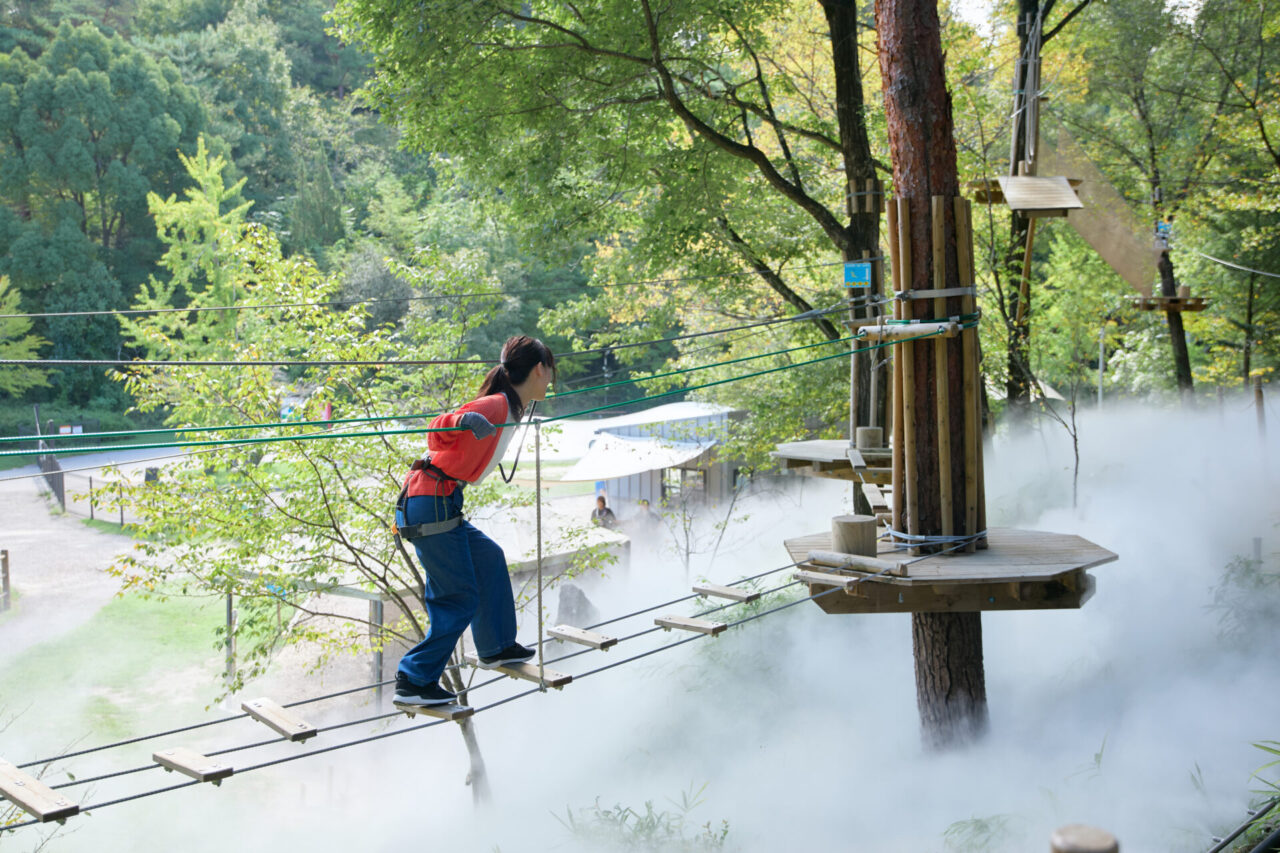 4つのコースにある計32種のアクティビティが体験できます。最終コースは東海地方で初めてとなる「池超えジップライン」で森林冒険を楽しむことができます。地上約12mから全長約50mのワイヤーを滑り降りる爽快感は、まるで鳥になったかのよう。身長110cm以上のお子様から挑戦でき、家族でワクワクを共有できる冒険エリアです。6月から11月まではコース内に超微粒ミストを発生させ、まるで雲海の上を冒険するかのような特別な体験ができます。体感温度も下がり豊田の猛暑を凌ぐアクティビティとなっています。