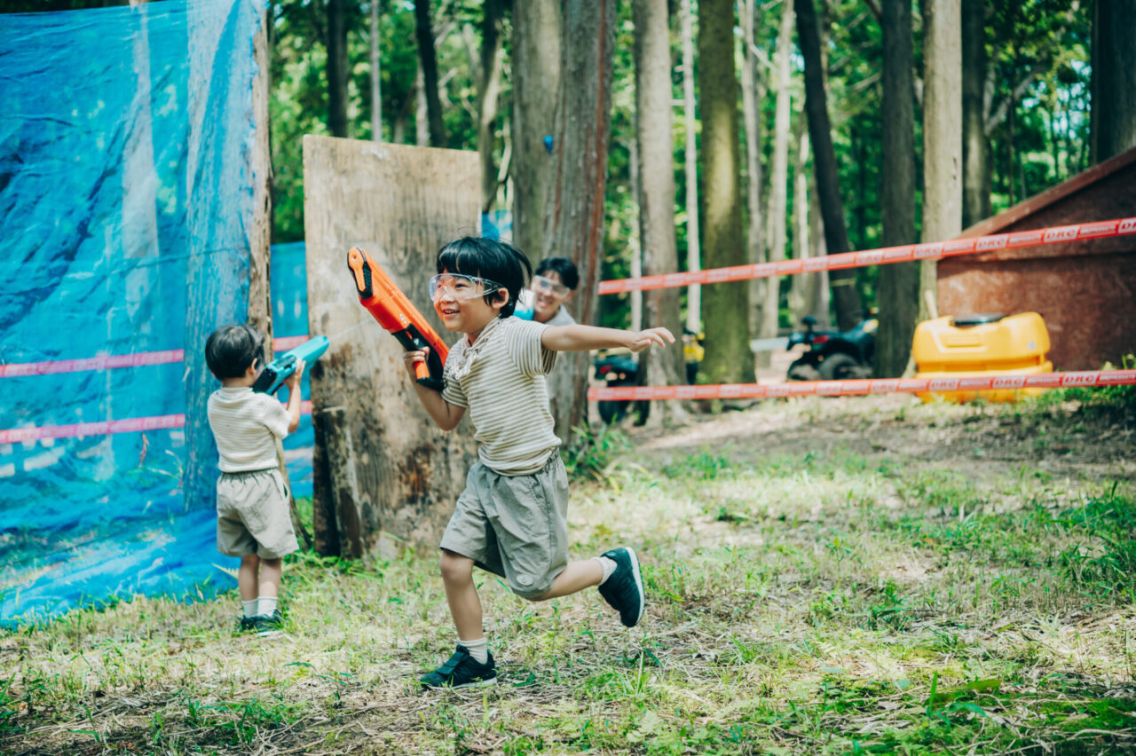 森の起伏ある地形をそのまま活かしたフィールドで、参加者は軽量かつ安全な電動ウォーターガンを手に、約70発連射可能なシューティングバトルを楽しめます。まるでゲームの中に入り込んだような爽快感と、自然の中で遊ぶ“攻め”のレジャー体験が魅力です。