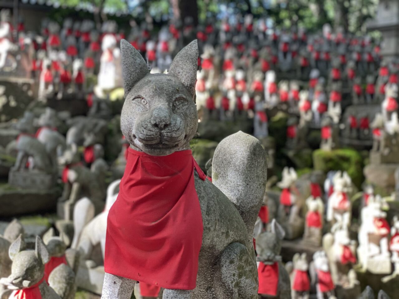 現在の境内には、1536年に建てられた山門や江戸期に再建された本殿が残っています。そして、数多くの狐の石像が並ぶ霊狐塚は圧巻の光景です。