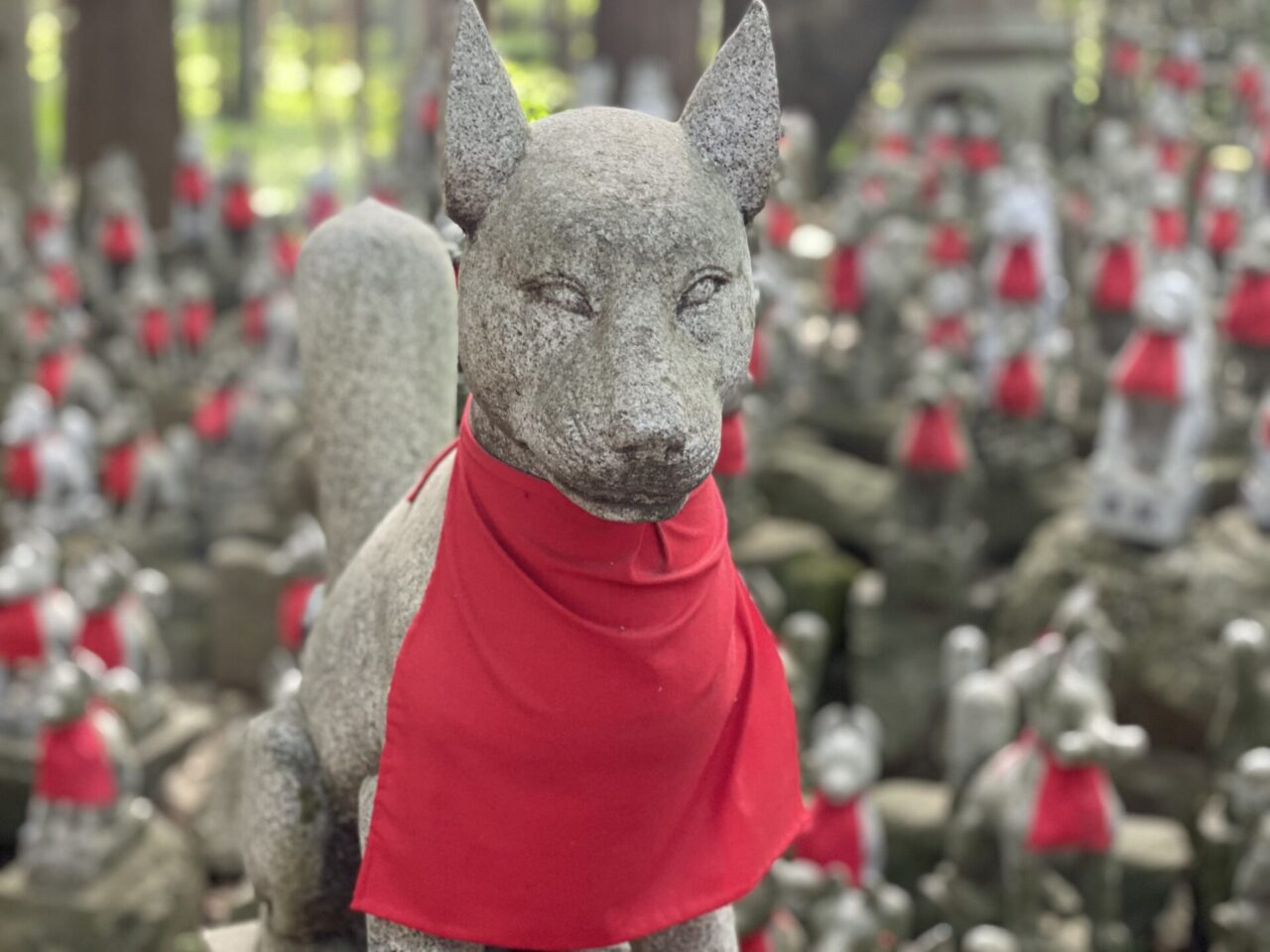 大本殿の背後に広がる一角に千体を超える狐の石像が祀られ、その光景は圧巻です。参拝者が商売繁盛や家内安全の祈願成就に感謝し、奉納したものが積み重ねられ、赤いよだれ掛けを付けた狐たちが整然と並ぶ姿は神秘的で、不思議な迫力を漂わせています。狐は稲荷信仰において神の使いとされており、参拝者はその前で静かに手を合わせ、願いや感謝の思いを新たにします。