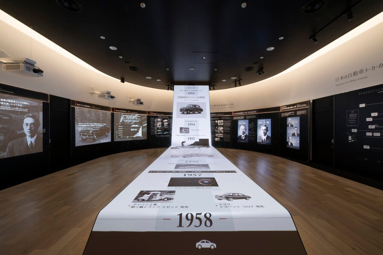 Surrounding the “History Road” are several themed areas: The “Story” area introduces the foundation of Japan’s automotive industry with panels and videos. The “People” area highlights pioneers and founders who contributed to the formation of the industry. The “Genealogy” area presents a large diagram showcasing the history of 12 major Japanese car manufacturers. The “Numbers” area displays an infographic charting Japanese automobile production numbers from 1904 to 2020, offering various perspectives on the establishment of Japan’s automotive industry.